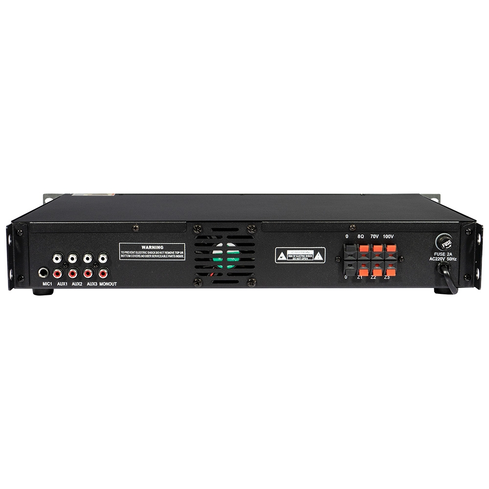 Mặt sau được trang bị 1 mic để kết nối micro có dây và có 4 cổng AV (bông sen) để cấp nhạc vào hoặc out ra các thiết bị khác và có các cổng out ra loa tiện dụng, được trang bị thêm 1 cái quạt tản nhiệt để thiết bị không bị nóng khi hoạt động trong thời gian dài.