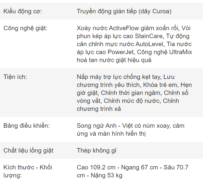 - Công nghệ: UltraMix, Stain Care, ActiveFlow, Inverter