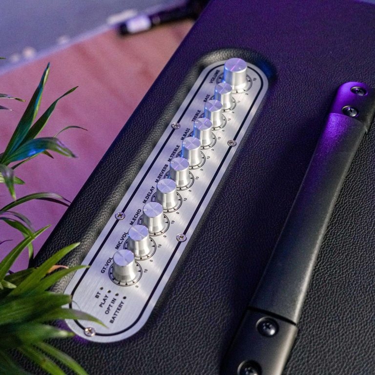 - Cổng kết nối: USB, SD Card, AUX, Guitar