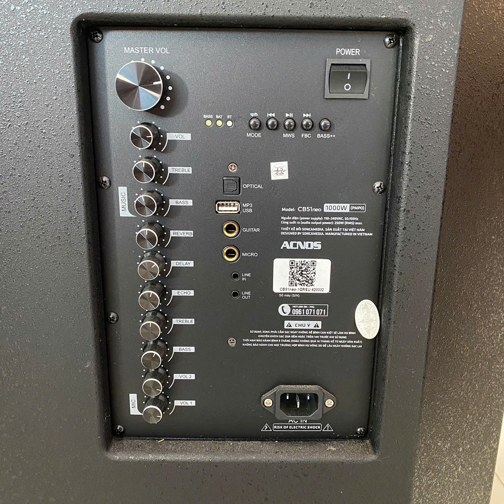 ACNOS CB51neo được thiết kế Thùng gỗ sơn gai màu đen, mặt lưới đen gắn kèm bánh xe dễ dàng di chuyển. Hệ thống loa bao gồm 1-loa BASS 50CM (18") + 1-loa TRUNG 16CM (6.5") + loa TREBLE cho âm thanh mạnh mẽ, dải âm nghe rõ nét hơn, trầm ấm phù hợp với không gian tiệc trong nhà, sân vườn hoặc các buổi dã ngoại, team building ngoài trời. Loa karaoke CB51neo có công suất RMS 250W tương đương công suất âm thanh PMPO lên đến 1000W. Micro nhôm UHF cao cấp không dây nhẹ hơi, nâng giọng hát karaoke chuyên nghiệp.