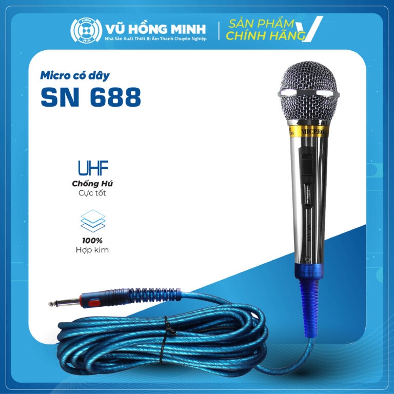Micro dây Micpro SN-688, Bộ micro gồm 1 tay mic thân màu bạc – đen, viền vàng và đuôi xanh dương, đầu lưới kim loại dạng viên bi, trên thân có công tắc bật/tắt cùng tem Micpro SN-688. Đi kèm là dây micro màu xanh dương có sẵn jack 6.5mm ở đầu cắm, phù hợp dùng cho hát karaoke, vocal, sân khấu nhỏ và các hệ thống âm thanh sử dụng micro có dây.