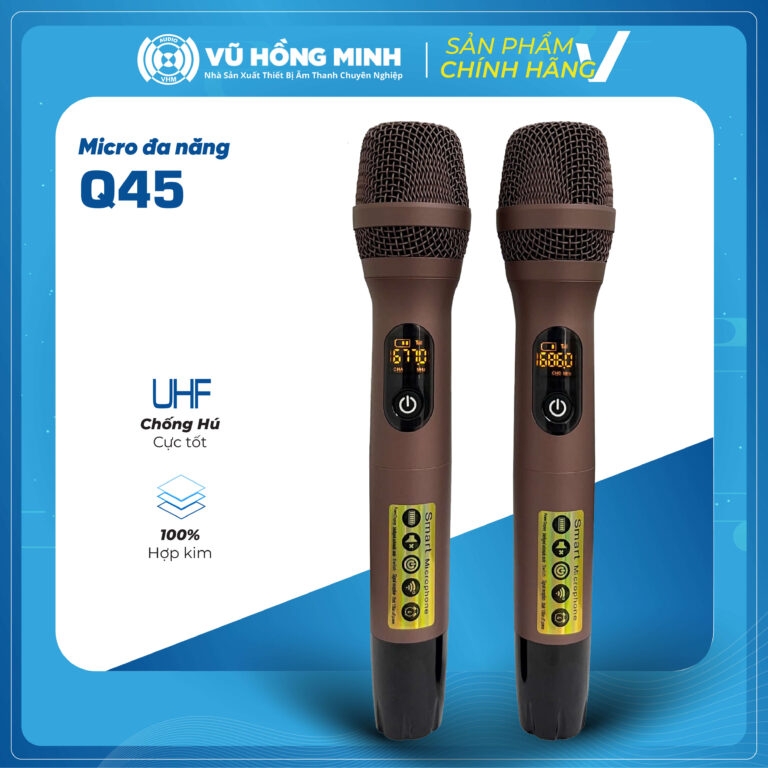 Micro đa năng Q45 thuộc dòng thiết bị âm thanh không dây – Model: RX–BU02MD, với thân mic màu nâu phối đen, được làm từ 100% hợp kim. Chiều dài micro khoảng 25cm, cho cảm giác cầm chắc tay và bền bỉ. Bộ sản phẩm gồm 2 tay micro, trên thân trước tích hợp màn hình LED nền cam cùng nút nguồn tròn giúp thao tác bật/tắt dễ dàng.