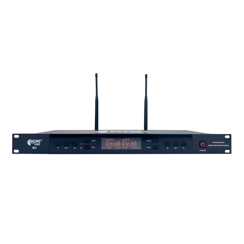 Hộp thu sóng KIWI M3 được thiết kế với mặt trước là mặt kim loại phay kết hợp cùng tấm mica cao cấp đen bóng tạo nên nét hiện đại, sang trọng. Chính giữa là màn hình hiển thị lớn với màu led vàng ấm tuyệt đẹp giúp các quý khách có thể theo dõi hoạt động của micro từ rất xa.